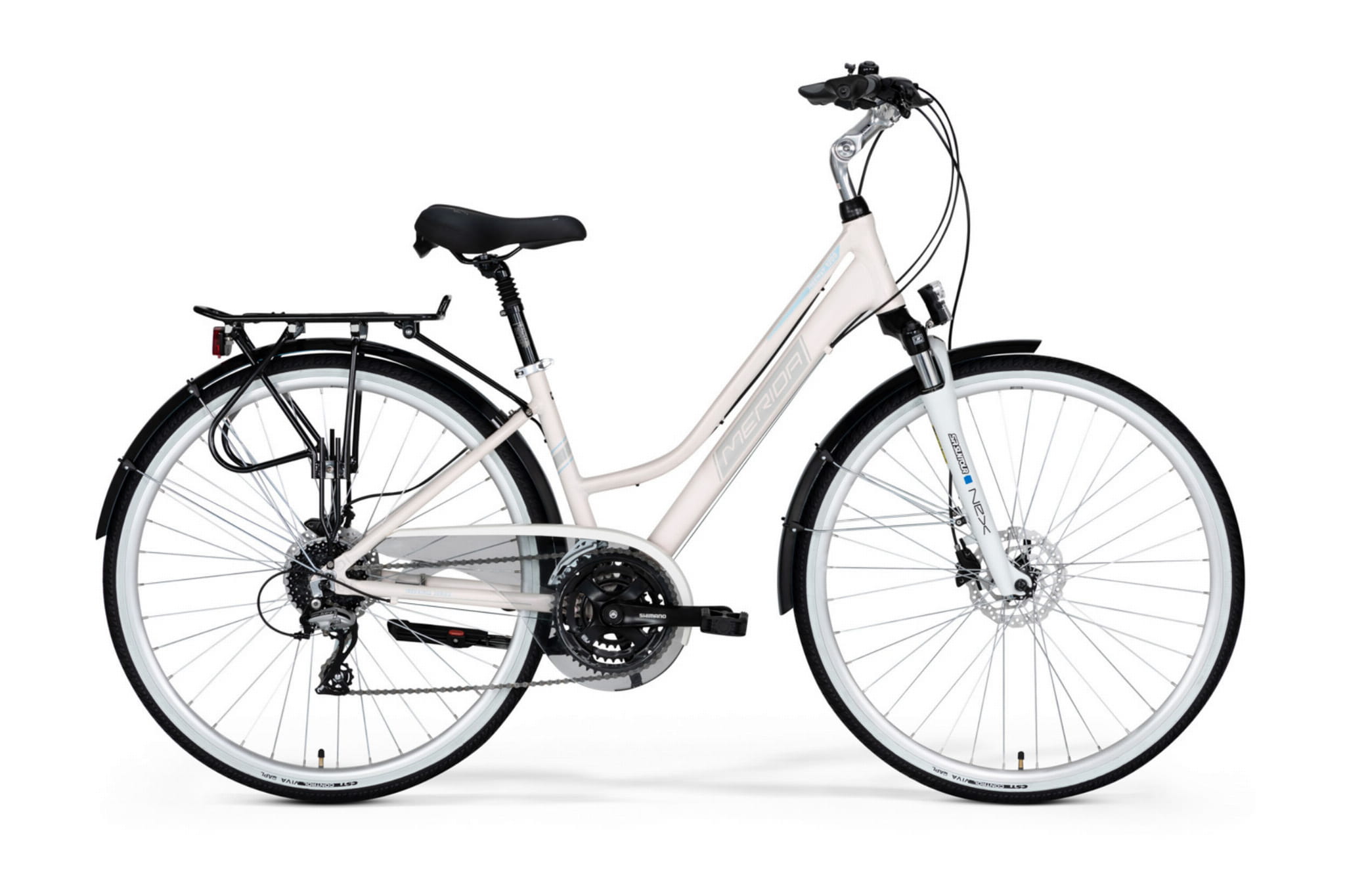 Komfortowy damski rower trekkingowy z mocną aluminiową ramą. Ma napęd Shimano 3x8, amortyzowany widelec, hydr. hamulce tarczowe Shimano i bogate wyposażenie, które sprawdzi się na co dzień i na wyprawie. Poczuj wygodę z Meridą Freeway 9200 Lady Disc!