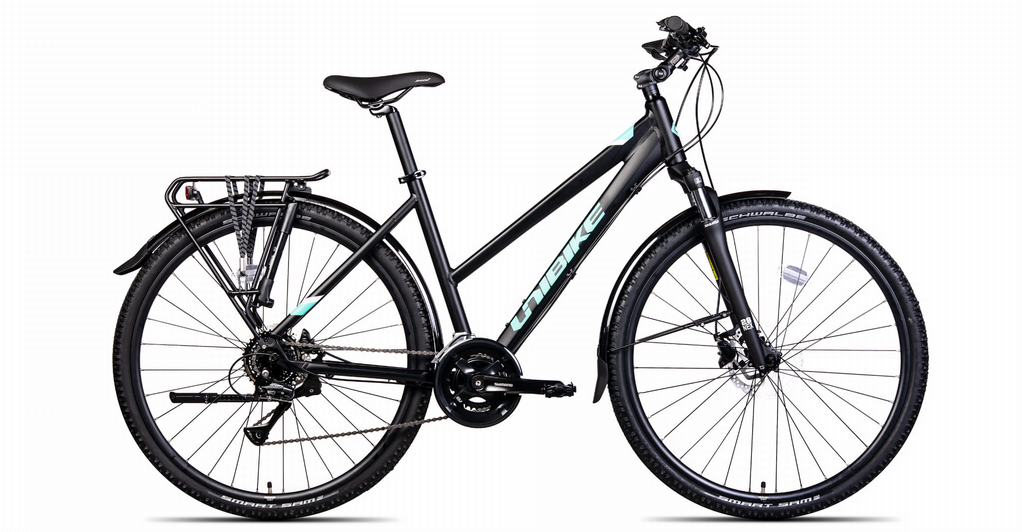 Aluminiowy rower na kołach 28", przeznaczony do przemieszczania się po utwardzonych drogach oraz w lekkim terenie. Wyposażony w bagażnik, błotniki, pompkę i podpórkę.