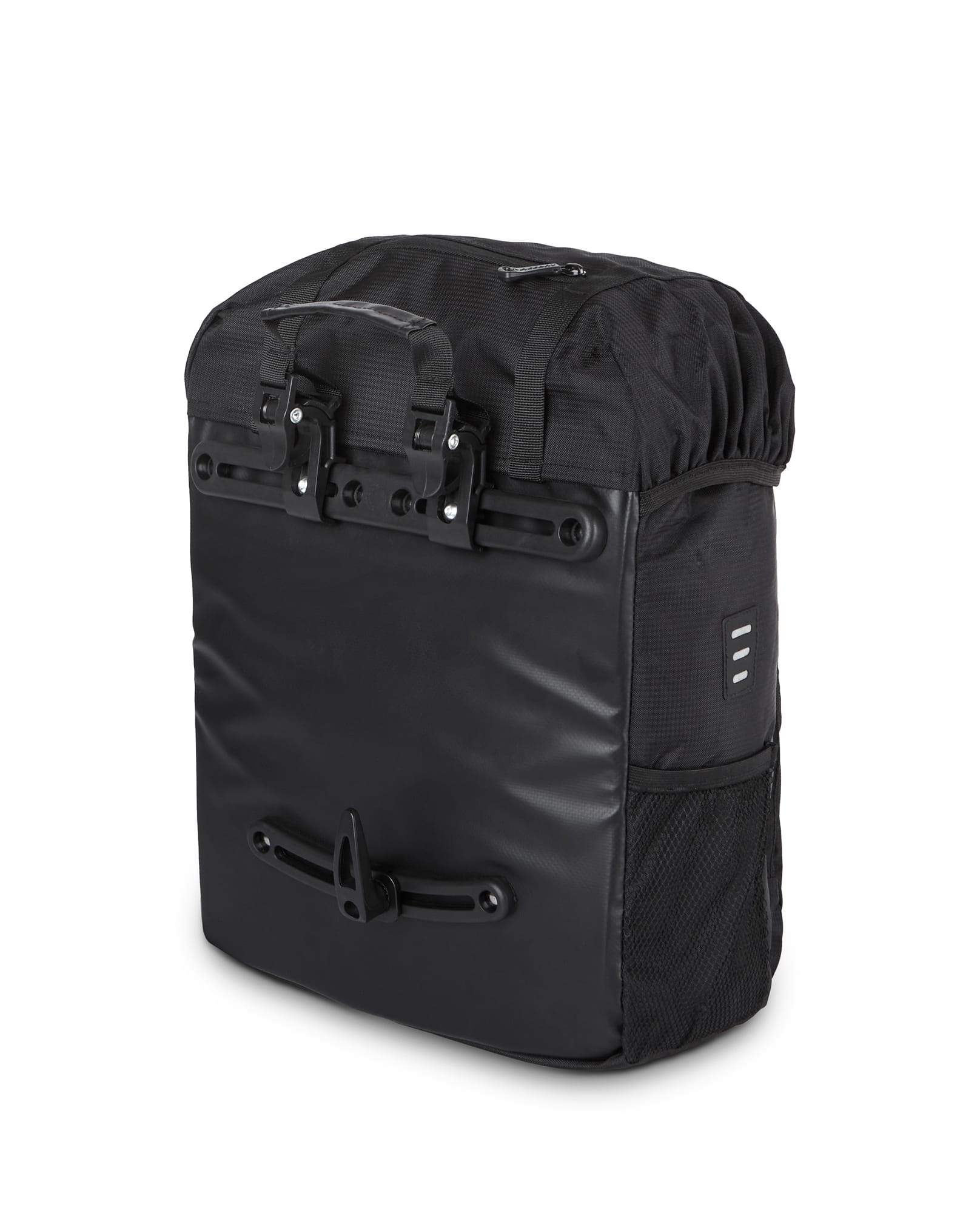 Boczna torba na bagażnik wykonana z trwałego, odpornego na uszkodzenia poliestru 400D. Od środka dodatkowo pokryta hydrofobową powłoką, gwarantującą wodoodporność i łatwość czyszczenia powierzchni - wystarczy wilgotna ściereczka, aby usunąć zabrudzenia. Usztywniona od strony mocowania na bagażnik.
