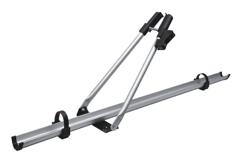 Aluminiowy uchwyt do przewożenia roweru na bagażniku dachowym samochodu.